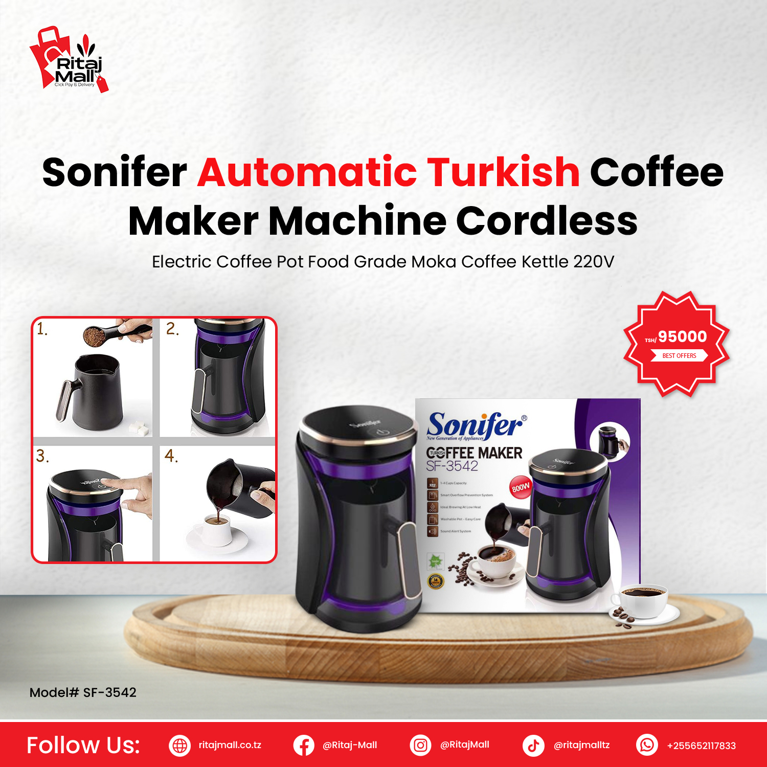 Turkish Coffee Maker (SF-3542) You can enjoy your delicious coffee perfectly prepared all day long with the SONIFER Automatic Turkish Coffee Maker Machine. This smartly protected coffee maker produces the perfect cup of coffee in minutes.
